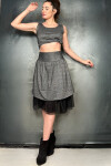 PIRILTILI TÜL DETAYLI MİNİ LİKRALI LAME GÜMÜŞ ETEK. Likralı kumaştan üretilmiştir.
